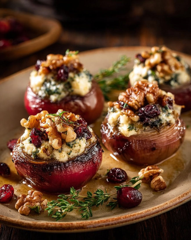 Gefüllte Ofenzwiebeln mit Blauschimmelkäse und Walnüssen sind köstlich!